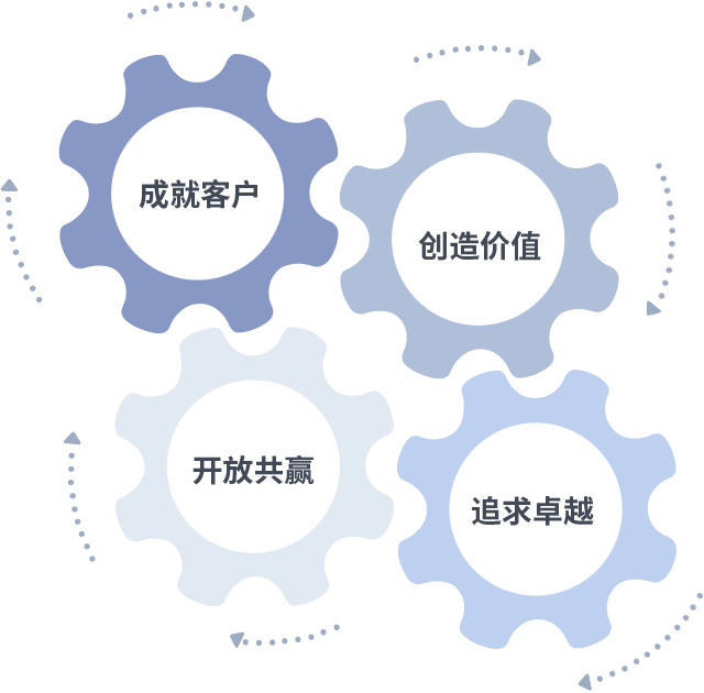 成就客户是一切决策的出发点,,创造价值是衡量所有工作的标准,,,追求卓越是我们做事做人的态度,,开放共赢是我们的格局也是最终的结果。。。价值观的齿轮环环相扣,,推动着组织里的每个人不断向前。。。